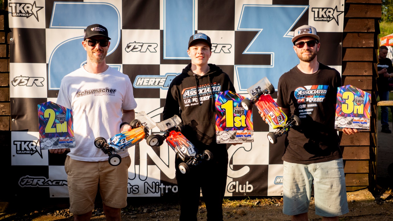 All that action made 2wd A final Leg 3 the decider. Tommy, Lee, Neil & Daniel could win it and based on Leg 2, Tommy Hall was surely the favourite. The race started and the field made its way round by race control with out incident. The first issue from Josh Holdsworth as he made his was towards the rostrum shortly after – clipping a hose and barrel rolling the car allowing Ben Smith though. There was immediately further drama when Holdsworth collected Smith over the tabletop dropping both down the order. Back at the front of the field the battle for the lead was between Cragg and Hall who were nose to tail. On the second lap the two jumped the table top very closely, then again almost inseparable through the right angle table top and proceeding double jump. On landing off the double, Cragg went wide – only a car’s width – which was enough for Tommy Hall to push through into the lead. Cragg applied pressure straight away and the battle continued through the next few corners and down the straight. Coming through the roller before race control Hall made an unforced errors and tipped the apex rolling his car over. Cragg with nowhere to go, collected him and cane to a dead stop as the marshal sprinted towards them. Taking full advantage, Lee Martin from third went around the outside of the incident and assumed the lead. Over the next couple of laps, Lee Martin looked smooth and in control. Various mistakes from Hall and Cragg left them trailing by five or six seconds. That nice lead was being eaten by Hall – grip was improving, and he was flying – but his attach was too heavy and crashed giving second back to Cragg. That change of order determined the final result. Although the Leg finishing order was Martin, Cragg, Hall – the second place position for Cragg propelled him to the overall win.