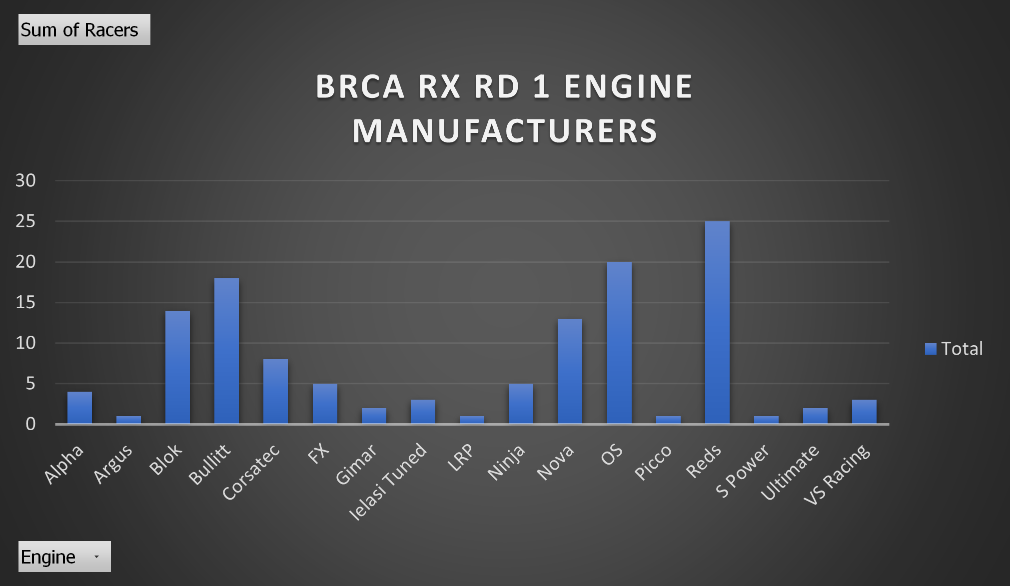 From the 126 entries for round 1 we have an incredible 17 different engine brands! Topping the list is REDS Racing with 25 entries followed by Japanese powerhouse OS with 20. Third most popular is Bullitt with 18. Blok and Nova are the fourth and fifth most popular amongst the entrants with 14 and 13 respectively.